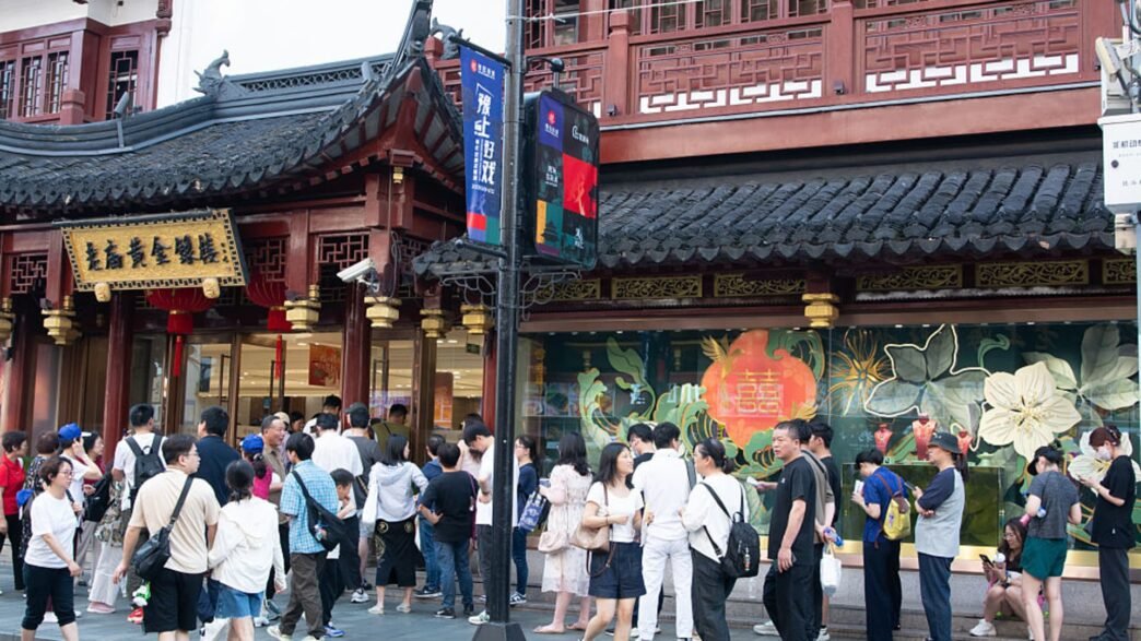 Huge waiting lines are seen in front of Yu Garden jewelry retail stores in Shanghai, China, on May 17, 2025, where the city offers consumption vouchers to stimulate consumer spending.